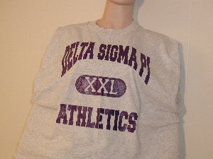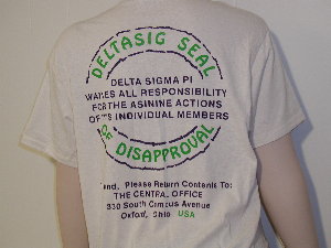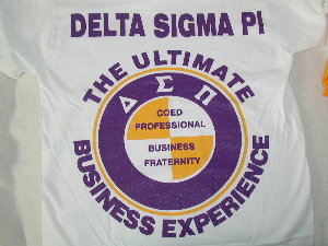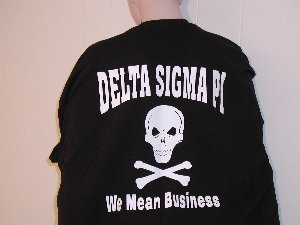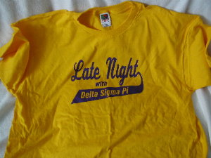 Late night with Delta Sigma Pi. One color front and one color back T-Shirt only available in Gold with purple design imprint. The back of the shirt lists the top ten reasons to join Delta Sigma Pi.