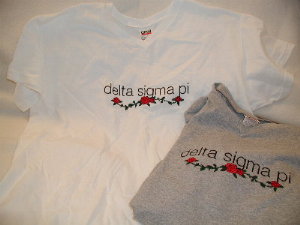 Delta Sigma Pi Embroidered Rose Ladies V-neck T-shirts. Available in Ash Grey and White
